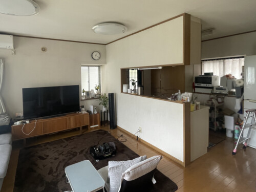 キッチンとダイニングの間仕切り壁は構造的に撤去できない部分だけを残しつつ、オープンな空間に生まれ変わりました。キッチン上の吊り戸棚と壁を撤去したことでキッチンとダイニングの天井がフラットにつながり、視覚的な広がりをもたらしています。