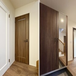 扉鏡は、靴を脱いで床に立っても靴を履いて三和土に立っても全身がチェックできるように位置を変更しました。