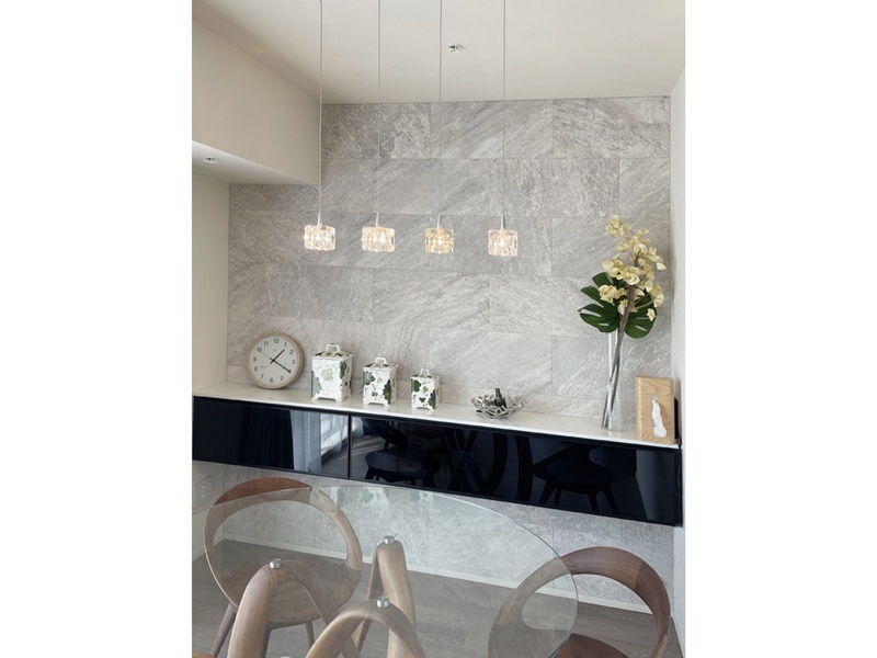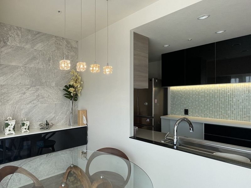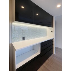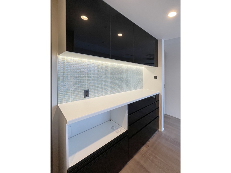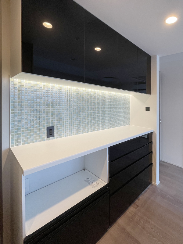収納、カップボード、腰壁の笠木にそれぞれブラックの鏡面仕上げやガラスを採用することで空間に統一感を持たせました。