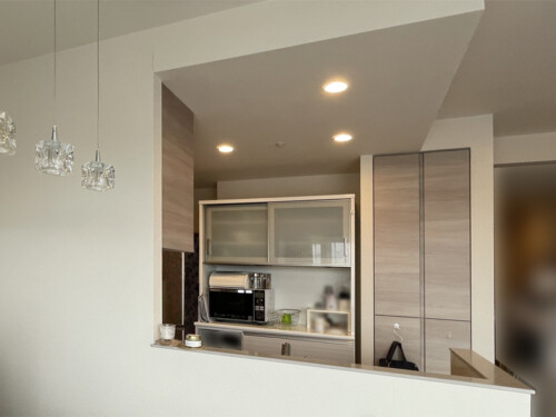 LDKで今回リフォームしたのはリビングの収納、カップボード、キッチン前の腰壁。