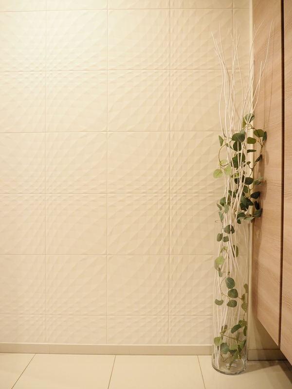 またお打ち合わせで、収納の上に思い入れのある置物をキレイに飾りたいと伺っていたので、置物とエコカラットが一番美しく見えるエコカラットの割付を職人さんと相談しながら考えました。