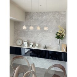 タイルはLIXILのガラスモザイクパーティカラーを採用し、端から端まで間接照明が美しく照らす設計にしました。照明の光がタイルの透明感を引き立て、キッチン全体が洗練された素敵な空間になりました。