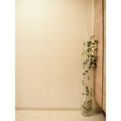 幾何学的なレリーフが光を柔らかく受け止め、玄関に立体感と上質な表情を生み出します。