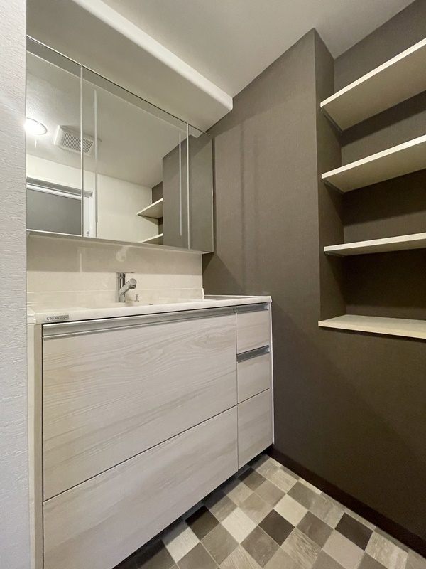 三面鏡下の水撥ねが気になる部分は、キッチンパネルを貼り、お掃除しやすいよう工夫しました。