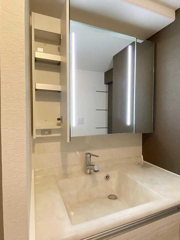 - 三面鏡×LEDライン照明のスタイリッシュなミラー