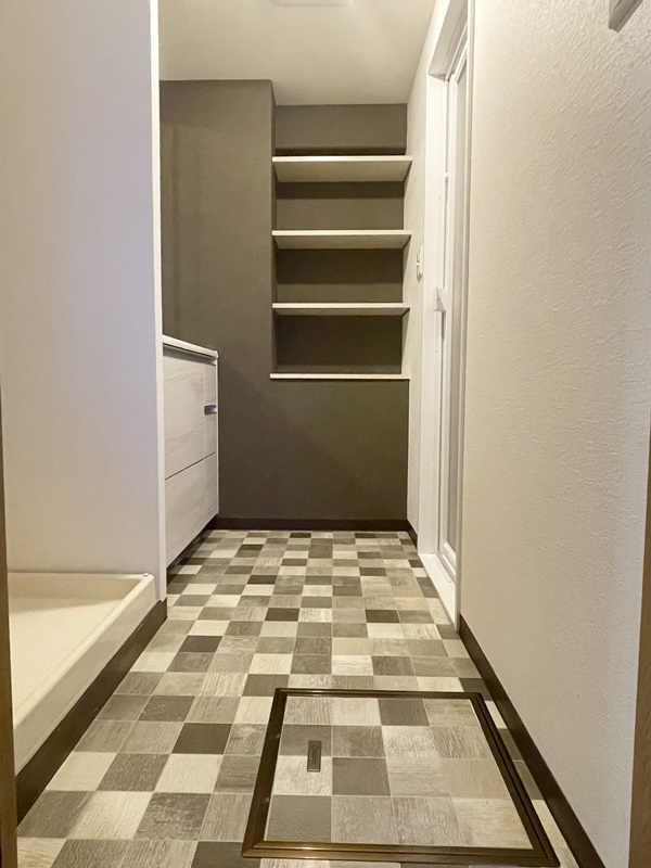 洗面台や浴室にベージュカラーが多かったので、洗面室の正面をブラウンのアクセントカラーにし、床材も大胆な市松模様を取り入れ、メリハリのある洗面室空間になりました。