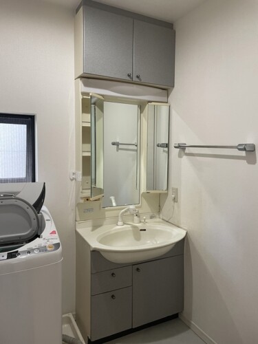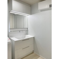 また、洗濯パンを撤去したことで、既存よりも間口の広い洗面化粧台を設置することができました。空間にゆとりが生まれ、使い勝手も向上しています。