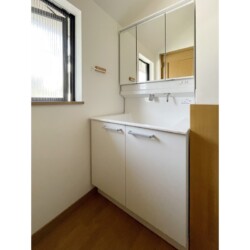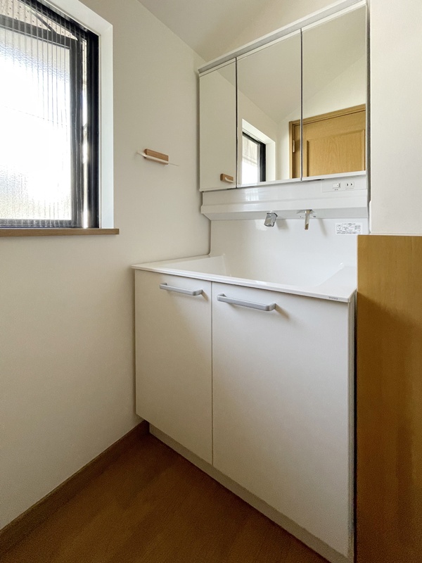 コスト面にも配慮し、1階とは異なるシリーズの洗面化粧台を採用。収納は引き出しではなく開きタイプを選択しましたが、使用頻度や収納量を考慮したうえで十分な機能性を確保しています。