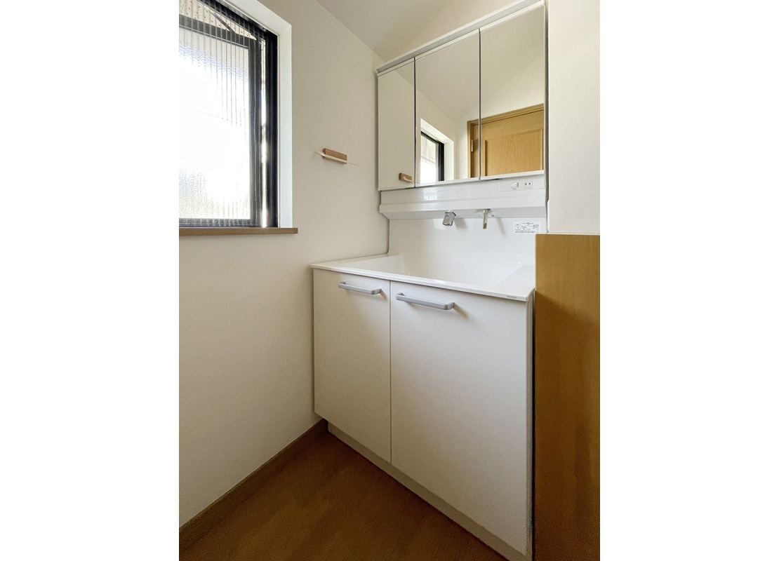2階の洗面室は、鏡が小さく使いづらいというお悩みがありました。そこで、間口いっぱいに広がる三面鏡を採用し、視認性と使い勝手を大幅に改善。鏡裏が収納になっているタイプを選んだことで、収納力も格段にアップしました。