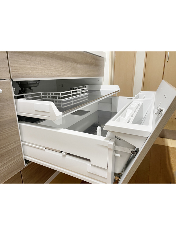 使い勝手はカタログを見ていてもわからないので、お客様と一緒にショールームへ。ショールームでは実際にキッチンを見て触っていただき、「らくパッと収納」のあるリシェルを採用することになりました。(らくパッと収納は、取り出しやすくてしまいやすい、大容量の収納です。)