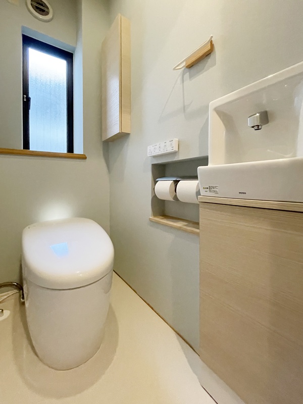 使用頻度やコスト面を踏まえ、2階のトイレはあえてタンク式のままに。とはいえ、機能性はしっかり上がっているので、日常使いにぴったりな快適空間へと進化しました。