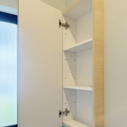 手洗い器と奥に設置した収納は、どちらも埋め込みタイプを採用。空間を圧迫せず、すっきりとした印象に仕上がっています。